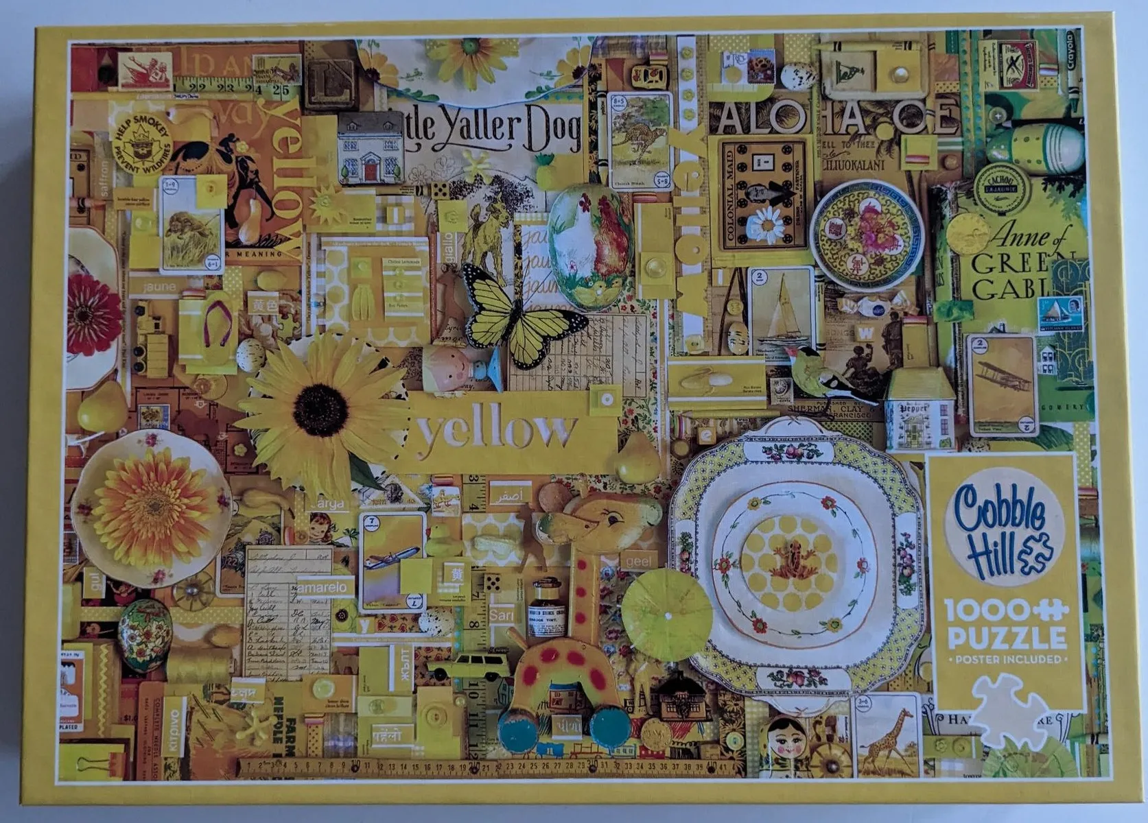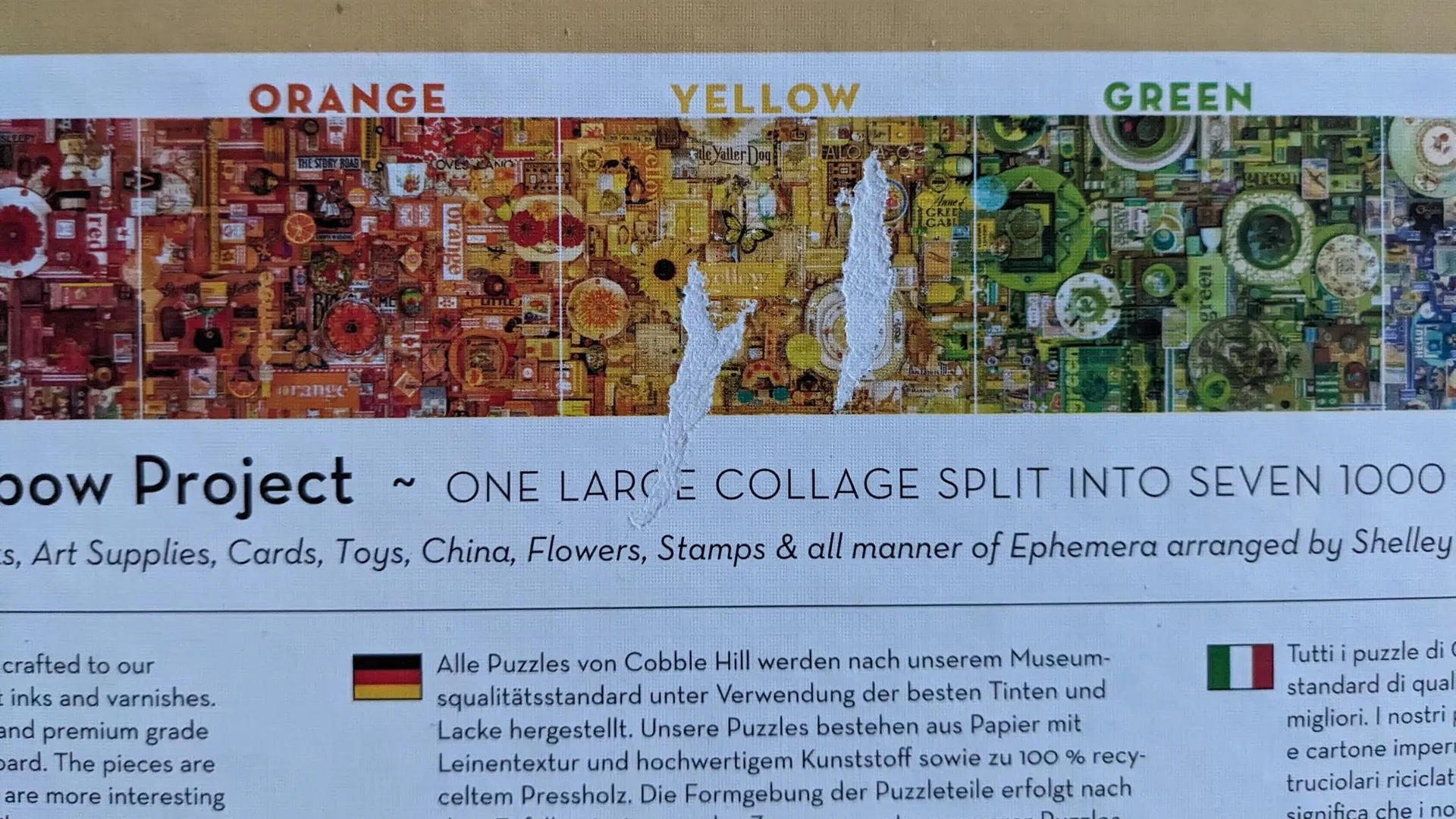 7. Yellow - Shelley Davies, Cobble Hill - Rainbow Collection, 1000 Teile. Fertiges Bild, 7€ - Eine Weile her gekauft. nur zweimal gepuzzelt. Die Box wurde beim Umzug mit Malerkrepp gesichert was leider eine Spur auf der Unterseite hinterlassen hat.